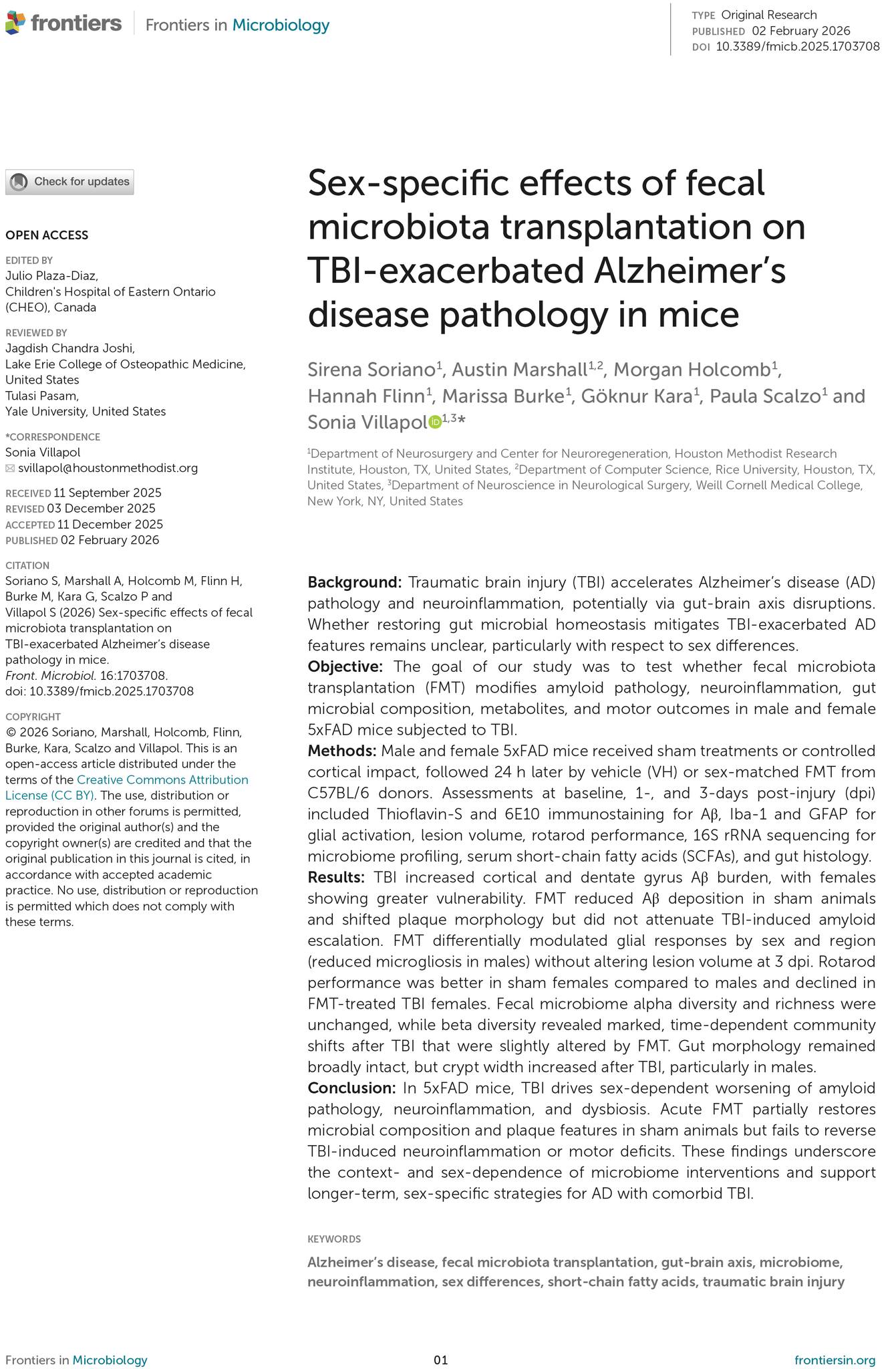 69. Soriano S, Marshall A, Holcomb M, Flinn H, Burke M, Kara G, Scalzo P, Villapol S. Sex-specific effects of fecal microbiota transplantation on TBI-exacerbated Alzheimer’s pathology in mice. bioRxiv [Preprint]. 2025 Sep 17:2025.09.11.675717. doi: 10.1101/2025.09.11.675717. PMID: 41000801; PMCID: PMC12458186.