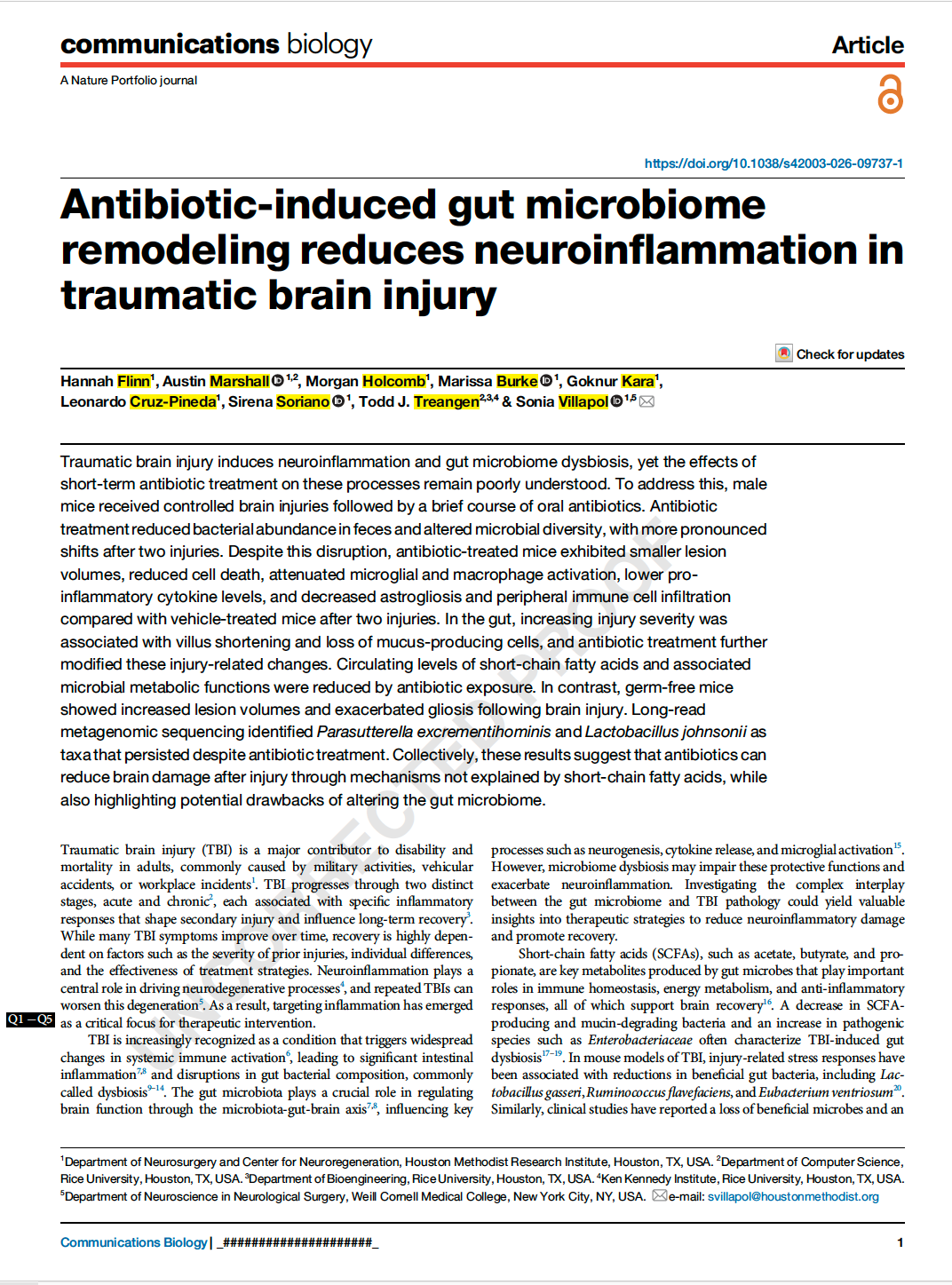 68. Flinn H, Marshall A, Holcomb M, Burke M, Cruz-Pineda L, Soriano S, Treangen TJ, Villapol S. Gut microbiome remodeling by antibiotics reduces neuroinflammation in traumatic brain injury. Res Sq [Preprint]. 2025 Sep 18:rs.3.rs-7411086. doi: 10.21203/rs.3.rs-7411086/v1. PMID: 41001537; PMCID: PMC12458575.