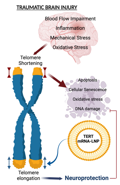 Traumatic brain injury (TBI) disrupts neural function in nearly three million Americans each year, causing cognitive deficits and, in severe cases, death. Emerging evidence links TBI to accelerated telomere attrition—shortening of the chromosomal end-caps that protect genomic integrity. We propose to develop an mRNA-based therapeutic strategy to lengthen telomeres in brain cells, with the goal of restoring motor and cognitive function after TBI.